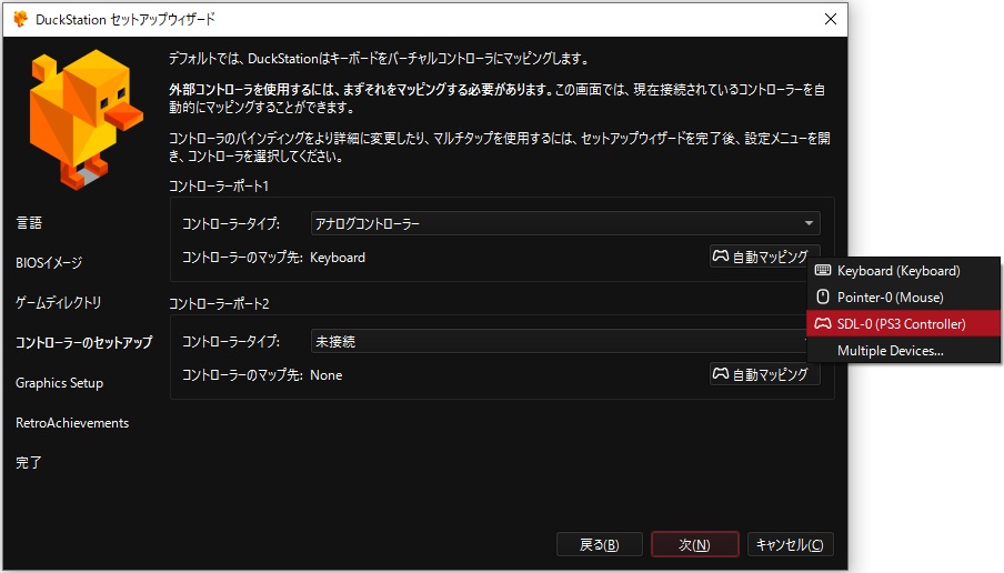 パッドの設定(コントローラー)では、PlayStation3DualShock を使用しています