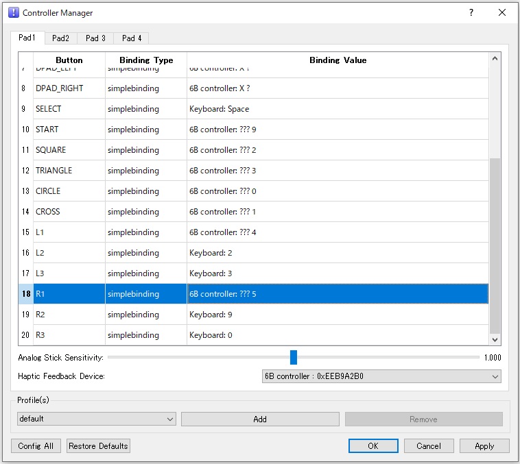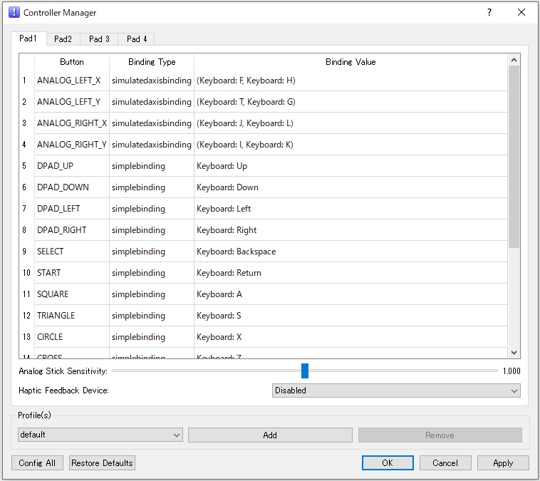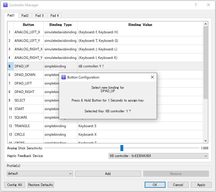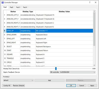 お持ちのゲームパッド(ゲームコントローラ)で設定を行うと、画像の様な表示にはなりませんが、【Haptic Feedback Device:】に表示されているゲームパッドのドライバが【Binding Value】に表示されますDPAD_UP [Button] の Keyboaed: Up [Binding Value] に合わせてクリックします