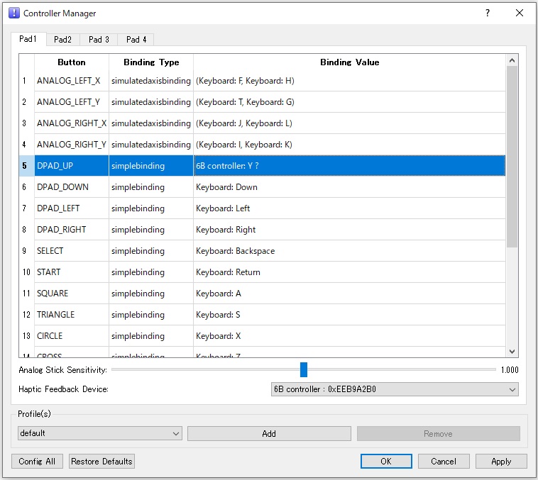 お持ちのゲームパッド(ゲームコントローラ)で設定を行うと、画像の様な表示にはなりませんが、【Haptic Feedback Device:】に表示されているゲームパッドのドライバが【Binding Value】に表示されますDPAD_UP [Button] の Keyboaed: Up [Binding Value] に合わせてクリックします