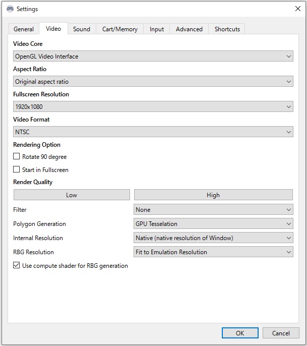 General・Video・Sound・Cart/Memory・Input・Advanced・Shortcuts の項目がある
