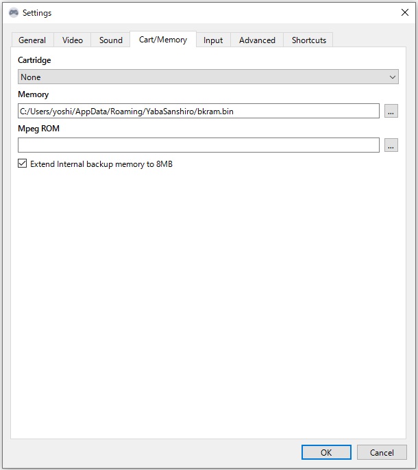 カートリッジスロットに差し込むカートリッジを選択します。YabaSanshiroの内部メモリは8MByteに拡張されており、Backup RAMを指定する必要はありません。