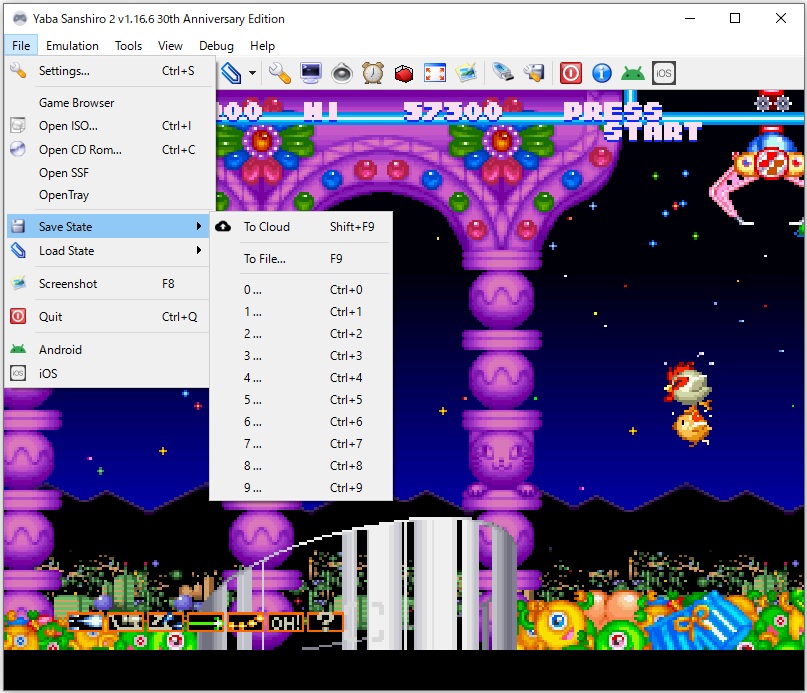 【File】⇒【Save State】⇒【0... Ctrl +0】 0~9スロットがあります